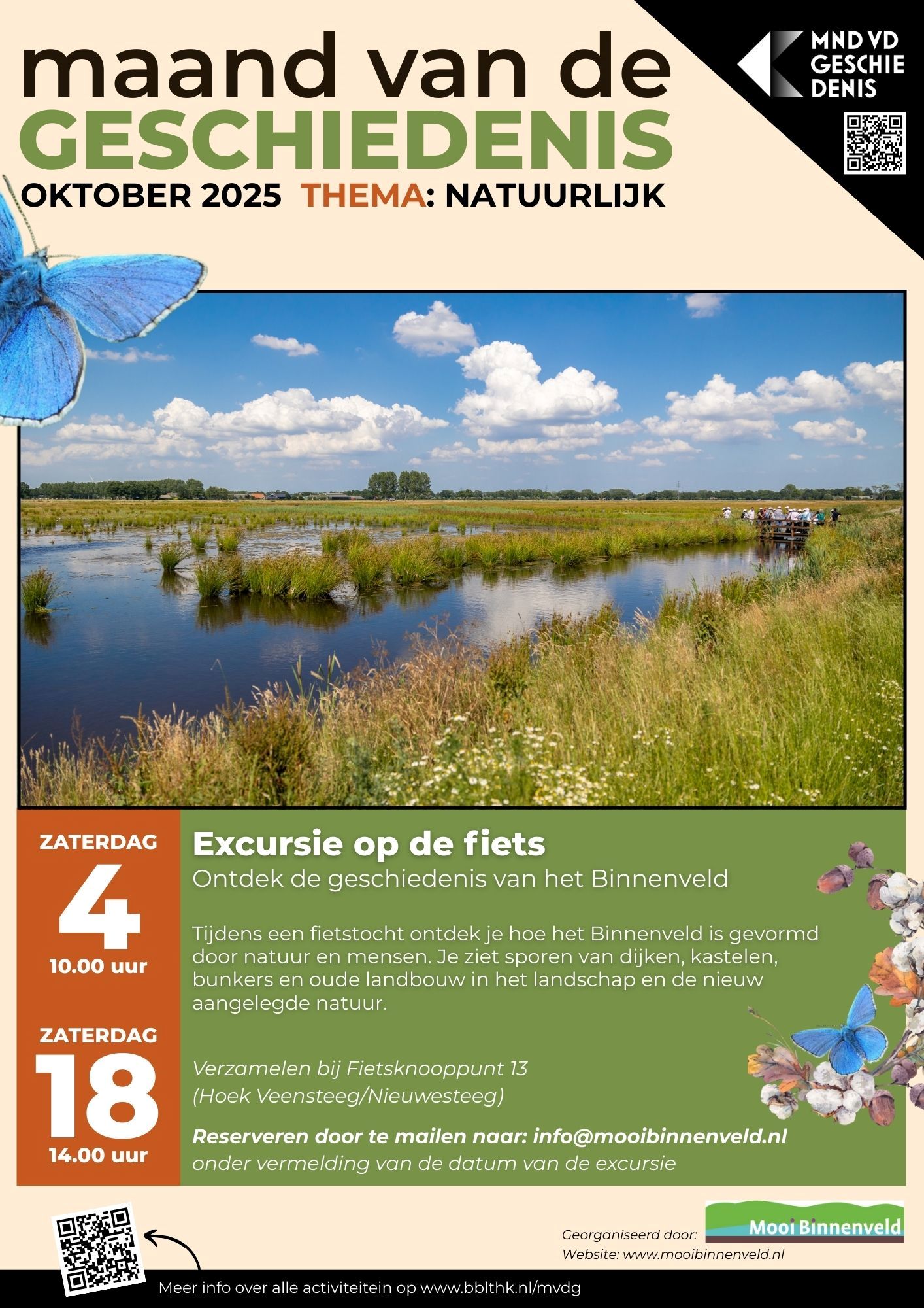 We gaan nu naar oktober, de Maand van de Geschiedenis, die dit jaar in het teken van de natuur staat. Het thema van dit nationale programma is in Wageningen: Het Binnenveld, Grenzeloos Natuurlijk. Zo is er een tentoonstelling in de Casteelse Poort en fietsexcursies over geschiedenis. Scan de QR code en meldt u aan voor de verschillende activiteiten.