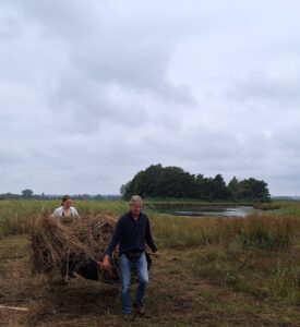 Omdat Thomas en Ruud al op woensdag maaiden bleek het hooi op zaterdag lekker droog. Dat is dus gemakkelijk wegsjouwen met de berries. Er kwamen zomaar 11 mensen op af om het hooi te dragen naar een plek waar tractoren kunnen komen. De Coöperatie Binnenveldse Hooilanden voert het vervolgens af, waarschijnlijk wordt dat bokashi, compost na anaerobe fermentatie.