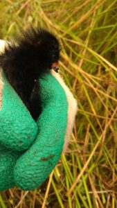 In het Binnenveld werd ondergetekende begin juli 2024 echter verrast door een klein, zwart pluizig kuiken tussen de vegetatie (zie foto). Na enig aarzelen en grote verbazing bleek het hier om een kuiken van het porseleinhoen te gaan. Het wegrennende grotere dier dat zich niet liet zien, moet één van de ouders geweest zijn. Ruim een maand later zag ik tot mijn grote vreugde nog een keer een jong porseleinhoen. Dit dier vloog vlakbij op en landde enkele meters verderop weer in de vegetatie; een vliegvlug dier. Half september werd er tot slot in het terrein van Staatsbosbeheer, ten zuiden van de Werftweg, een juveniele porseleinhoen gezien door meerdere mensen en gemeld op waarneming.nl.