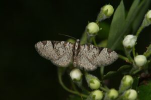 Een paar soorten worden hier uitgelicht. De gestippelde rietboorder (foto boven ©André Nagelhout) is een soort met maar weinig vindplaatsen in Gelderland. In 2023 en 2024 zagen we nog maar 2 exemplaren maar afgelopen jaar waren het er 15 dus hij lijkt zich uit te breiden. De fruitboomdwergspanner (foto hiernaast ©Jeroen Voogd) is een zeldzaam en ernstig bedreigd vlindertje dat vooral leeft op meidoorn, een korte vliegtijd heeft en slecht op licht afkomt. Hij is twee keer gezien, in 2024 en 2025, dus hij lijkt zich hier gevestigd te hebben.